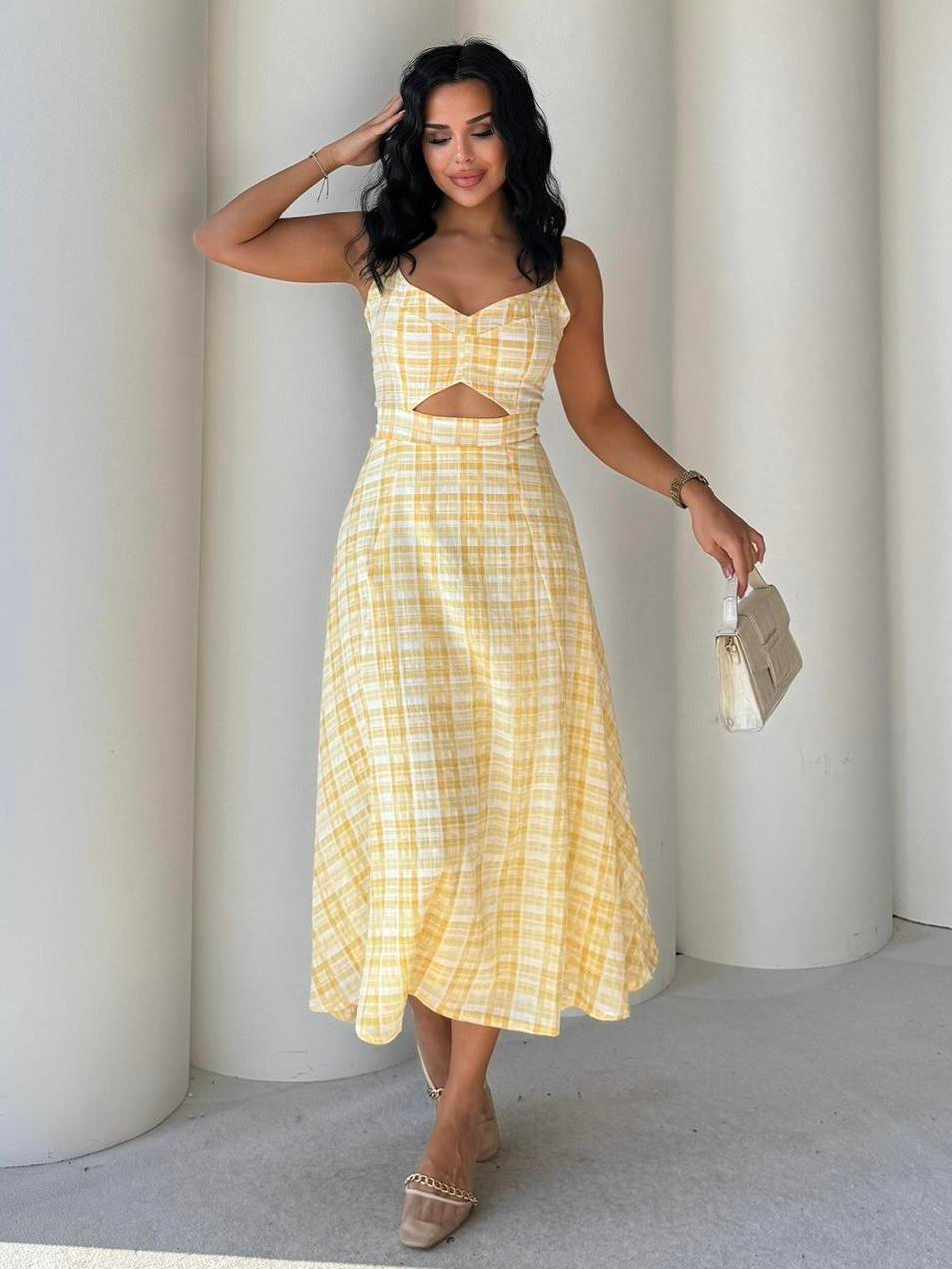 Cent Ekose Detaylı Midi Boy Elbise Sarı