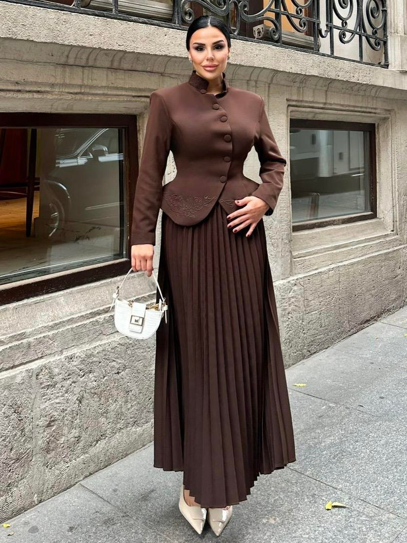 Retrona İşleme Detaylı Etekli Takım Kahve