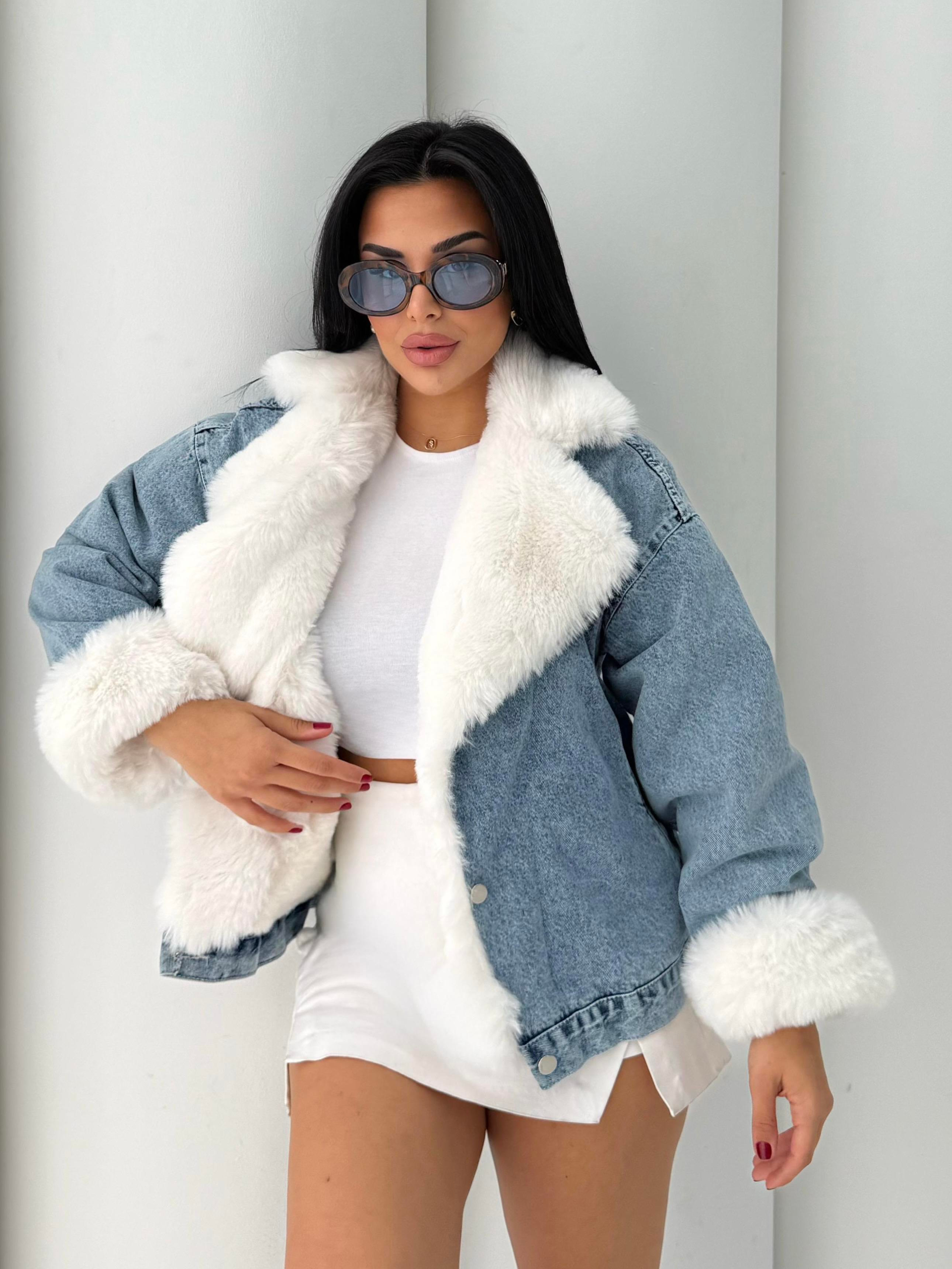 Yonie Kürk Detaylı Denim Ceket Mavi-Beyaz